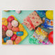 Um brilhante e colorido quebra-cabeça de bolos de aniversário e biscoitos, presentes e balões. Divertido para toda a família trabalhar juntos. Este quebra-cabeça fornecerá horas de entretenimento.