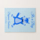 Este incrível quebra-cabeça de quebra-cabeça apresenta uma imagem de arte digital de uma fofa azul-bebê com nariz preto e sussurros, cauda azul brilhante e arbustiva e barriga e até dedos e dedos azuis. Uma design para celebrar um bebê. Há texto personalizado para que você possa incluir o nome do bebê e a data de nascimento.