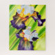 Bela pintura original de arte de flor de íris colorida roxa amarela e verde. Cores vibrantes brilhantes. Arte fina em aquarela.