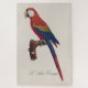 A imagem apresenta uma ilustração detalhada da Arara-vermelha (Ara macao), também conhecida como Arara-de-bico-vermelho, elegantemente empoleirada em um galho texturizado. Esta obra de arte é característica do refinado estilo de história natural iniciado por Jacques Barraband, cuja atenção meticulosa à cor e à anatomia trouxe aves exóticas à vida em publicações científicas iniciais. A plumagem vermelha vibrante da arara domina a composição, complementada por faixas impressionantes de amarelo dourado e azul profundo ao longo de suas asas e cauda alongada. Seu bico robusto e curvo e a pele facial pálida, delicadamente marcada com padrões de penas, são renderizados com precisão, enfatizando tanto a beleza quanto a precisão biológica.