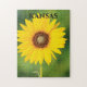 Uma fotografia de um Sunflower Selvagem do Kansas que é brilhante e colorido com um fundo verde. É ao sul de Sterling Kansas USA numa estrada country. Isso é em um Quebra-cabeça.