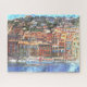 Linda e colorida paisagem da cidade portuária de Riviera durante a época de verão, pintura aquarelle. Este quebra-cabeça de serra foi criado para o amante da França, da costa francesa da Riviera, da Europa em viagem, da costa mediterrânica, das férias ou de cores brilhantes e vibrantes do Verão.