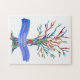 Este quebra-cabeça na moda é decorado com um design de árvore da família colorida, assim como um traço azul de pincel de aquarela.