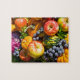 Esta quebra-cabeça de serra colorida apresenta uma colheita abundante que inclui maçãs estaladiças, abóboras laranja, ervas frescas, uvas concórdias, couve vermelha e gourdes. Uma exibição deliciosa de frutas e legumes frescos.