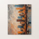 This jigsaw puzzle features an abstract acrylic painting that beautifully captures a cityscape at sunset. It's composed of bold, geometrically shaped buildings standing against the backdrop of a dramatic sky. The buildings, in shades of blue, gray, and black, add a sense of depth and dimension to the scene. The waterfront, dotted with trees, adds a touch of nature to the urban landscape. The trees, in a vibrant shade of orange, hint at the autumn season. The buildings and trees cast their reflections onto the water, creating a mirror-like effect. The dramatic gray, orange, white and blue sky seems to change with the setting sun, adding a sense of dynamism. This modern art puzzle, with its abstract depiction of a city at sunset, is sure to captivate anyone with its bold colors, dramatic imagery, and artistic flair. It’s a testament to the beauty that can be found in urban landscapes and the changing seasons.