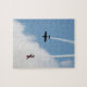Dois propulsores de hélice se engajam em uma luta de combate a ar de asa fixa nas nuvens de cúmulo e no céu azul acima do chão do airshow.