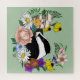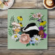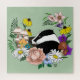 Um texugo preto e branco giro sentado entre flores e cogumelos silvestres em pano de fundo verde-sábio