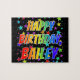 Esta divertida, excitante, quebra-cabeça de quebra-cabeça com tema de aniversário tem a mensagem "FELIZ ANIVERSÁRIO, BAILEY" com os personagens que têm um espectro colorido de arco-íris inspirado em um padrão de gradação, além de um padrão de fundo de estrelas vibrante. Um quebra-cabeça vibrante como este pode ser uma maneira divertida de enviar cartões de aniversários a alguém chamado Bailey. [~Z0000468]