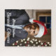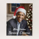 Este trabalho de arte tem o 44 do presidente dos EUA Barack Obama vestindo um chapéu de Papai Noel perto de uma árvore decorada.