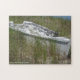 Um barco branco pequeno que seja encalhado permanentemente nas costas de Virgínia na grama e na areia.