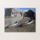 Esta foto original da cena costeira neste quebra-cabeça de serra de excelente mostra dois pequenos barcos a motor "estacionados" pela parede do mar. Ao fundo há prédios antigos, aterrados, em inglês, como os do estilo Norfolk flint e brick. Esta imagem à beira-mar rural é no sudoeste da Anglia Oriental, Inglaterra, a cena é colocada contra um céu azul de verão. O quadro à beira-mar é uma imagem típica de uma das muitas cidades costeiras tradicionais e muito antigas da Inglaterra.
