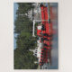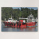Barcos vermelhos brilhantes numa marina, com árvores verdes ao fundo.