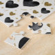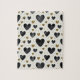 Elegante e moderno, este quebra-cabeça apresenta um padrão contínuo deslumbrante de corações em texturas contrastantes. Corações grandes e negros em aquarela ancoram a composição, enquanto corações menores e brilhantes em glitter dourado adicionam um toque de brilho. Espalhados por toda parte estão delicados flocos dourados e linhas pintadas à mão, todos definidos contra uma tela limpa e esbranquiçada. A natureza repetitiva dos corações, juntamente com as texturas distintas da "tinta" e do "glitter", proporciona uma experiência de montagem rítmica e satisfatória que é ao mesmo tempo elegante e divertida.