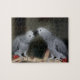 Um belo e jovem par de papagaios de cinzas africanas beijando brincalhão. Fotografia animal por Susan.