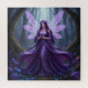 Uma bela fada vestindo um vestido roxo que flui e um colar feito de ametistas com violetas em seus longos cabelos roxos e asas tipo libélula roxa, segurando uma brecha violeta em uma floresta mágica cercada de cogumelos, flores e mossas coloridas, árvores cobertas de videira.