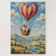 A detailed, whimsical pastel painting featuring a single, perfectly groomed white Bichon Frise sitting excitedly in the basket of a giant, striped hot air balloon shaped like a massive ruby-red heart. A magical Valentine's Day gift for Bichon owners.