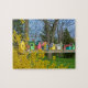 Esta adorável quebra-cabeça de serra mostra uma fileira de casas coloridas de pássaros caindo no sol primavera. Um arbusto amarelo da forítica, árvores, céu azul e grama verde enquadram a fileira de casernas únicas.