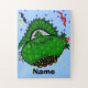 Personagem de desenho animado de espaçonave verde e divertido. Personalize com o nome da criança em texto vermelho. Navio legal com olhos castanhos, nariz perfurado, ouvidos, cauda e asa, e uma boca vermelha de chama no lado direito do navio viajando na galáxia de estrelas e relâmpagos vermelhos, pretos e amarelos. Design de Personagem de desenho animado de Arte Original © 2014 TamiraZDesines.