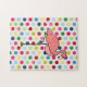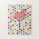 Quebra-cabeça de serra de vaivém cor-de-rosa moderno, funky do flamingo com um flamingo lunático, retro do rosa do olhar do vintage do chique em um fundo colorido moderno do teste padrão de bolinhas do grunge. Um divertimento, um presente bonito, original para mulheres e umas crianças.
