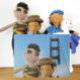 Bonecos de férias em São Francisco. Dois bonecos crochê tiraram uma selfie em frente à Ponte Golden Gate. Um boneco usa óculos de sol, o outro usa um chapéu. A névoa está rolando na ponte.