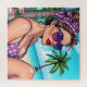 O verão divertido vibra arte em parede com uma senhora bonito em um biquíni bolinhas roxo na praia, no estilo de um gibi tropical.