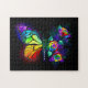 Borboleta monarca pintada artisticamente, luminosa e arco-íris com buquê de rosas iridescentes, brilhantes e luminosas em fundo preto. Borboleta arco-íris.