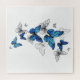 Borboletas azuis voadoras morfo e borboletas brancas em um fundo de abstrato leve. Morpho. Design com borboletas azuis morfo.