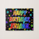 Este design de quebra-cabeça de campo, divertido e com tema de aniversário, apresenta a mensagem "FELIZ ANIVERSÁRIO, BRIANA" com os personagens que têm um padrão de gradiente inspirado no espectro colorido do arco-íris, além de um campo vibrante de padrão de fundo das estrelas. Um quebra-cabeça colorido como este pode ser uma maneira divertida de enviar cartões de aniversários para alguém chamado Briana. [~Z0000468]