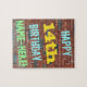 Este design de quebra-cabeça com tema de aniversário divertido apresenta uma mensagem como "HAPPY 14 BIRTHDAY, NAME-AQUI!", onde o nome pode ser personalizado. O fundo apresenta uma representação de uma parede de tijolos constituída por alguns tijolos de cor castanha avermelhada. O texto de mensagem personalizável apresenta cores como azul, amarelo e verde, e tem uma aparência inspirada pela do grafite pintado. Um quebra-cabeça como este pode ser usado como uma maneira divertida de enviar desejos de aniversário a alguém que comemora seu décimo quarto aniversário, e que talvez goste muito de fazer quebra-cabeça. [~Z0000285]