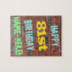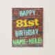 Este design de quebra-cabeça com o tema de aniversário divertido apresenta uma mensagem como "FELIZ 81ruas ANIVERSÁRIO, NOME AQUI!", onde o nome pode ser personalizado. O fundo apresenta uma representação de uma parede de tijolos constituída por alguns tijolos de cor castanha avermelhada. O texto de mensagem personalizável apresenta cores como azul, amarelo e verde, e tem uma aparência inspirada pela do grafite pintado. Um quebra-cabeça como este pode ser usado como uma maneira divertida de enviar desejos de aniversário a alguém que comemora seu oitenta aniversário, e que talvez goste muito de fazer quebra-cabeça. [~Z0000285]
