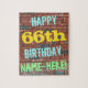 Este design de quebra-cabeça com tema de aniversário divertido apresenta uma mensagem como "FELIZ 66º ANIVERSÁRIO, NOME AQUI!", onde o nome pode ser personalizado. O fundo apresenta uma representação de uma parede de tijolos constituída por alguns tijolos de cor castanha avermelhada. O texto de mensagem personalizável apresenta cores como azul, amarelo e verde, e tem uma aparência inspirada pela do grafite pintado. Um quebra-cabeça como este pode ser usado como uma maneira divertida de enviar desejos de aniversário a alguém que comemora seu sexagésimo sexto aniversário, e que talvez goste muito de fazer quebra-cabeça. [~Z0000285]