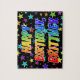 Este animado design de quebra-cabeça com tema de aniversário, vibrante, tem a mensagem "FELIZ ANIVERSÁRIO, BRITTNEY" com os personagens que têm um padrão de gradiente incrivelmente brilhante, inspirado no espectro arco-íris, além de uma estrela empolgante molda o plano de fundo. Um quebra-cabeça colorido como este pode ser usado para enviar uma mensagem de saudação de aniversário a alguém chamado Brittney. [~Z0000468]