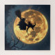 Uma bruxa super legal em uma vassoura em frente a um quebra-cabeça de Dia das Bruxas na Lua de cheio.