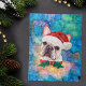 Bulldog Francês Raça Cachorro Natal apresenta uma aquarela de um Bulldog Francês com um chapéu de Papai Noel vermelho, uma coleira de Natal vermelha e uma aquarela de galáxia.
