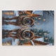 This festive design captures the joyful spirit of the holiday season, featuring an adorable dogs.Nestled in a winter wonderland, complete with a decorated Christmas tree, and beautifully wrapped presents. Snowflakes gently fall, adding a magical touch to the scene, while the vibrant colors of the holiday decorations create a warm and cheerful atmosphere.