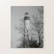 Esta é uma foto em preto e branco do Farol de Cape May. Conhecido como Cape May Light, está localizado no sul de Nova Jersey no Cape May Point State Park. O farol está na ponta de South Jersey e serve como um farol para os navios que chegam. Essa foto foi tirada no inverno, e o farol pode ser visto pelos ramos nuos das árvores em primeiro plano. O farol é um marco do NJ, uma atração turística de Cape May, e uma bela obra de arquitetura.