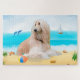 Um cão aficionado sentado na praia é uma ideia perfeita de presente para alguém que ama esta raça de cães.