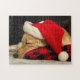 Esta quebra-cabeça de quebra-cabeça mostra uma fotografia de um cão que recupera um ouro que está vestindo um chapéu de Papai Noel e dormindo em um travesseiro de xadrez vermelha.