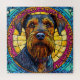 Retrato de um cão com uma barba espessa e farta e olhos expressivos, emoldurado por um fundo vibrante semelhante a vitral em tons de amarelo, rosa e azul.