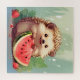 ilustração encantadora de um ouriço desfrutando um pedaço de melancia. O ouriço tem uma expressão feliz, com os olhos fechados em deleite, e está cercado por alguns morangos e folhas. O estilo de desenho de tinta adiciona um toque brilhante e fofo à cena.