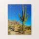 A fotografia caracteriza um grande cacto multi-armado do saguaro por uma fuga de caminhada que conduza para uma montanha strewn pedregulho no deserto de Sonoran.