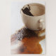Café e cafés espalhados em fundo branco. Xícara de café com cafés.