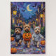 Adoráveis Terriers do Cairn vestidos com fantasias lúcidas de Halloween carregar baldes de abóbora enquanto trick-or-tratando sob o céu iluminado. Este design festivo destaca a casaco esfarrapada da raça, a personalidade viva e o espírito aventureiro, capturando perfeitamente a atmosfera assustadora e divertida da noite de Halloween. Uma celebração encantadora para amantes de cães e fãs de Halloween.