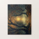 Uma pintura ao estilo barroco de um misterioso caminho florestal banhado à lua, onde árvores tortas arruinam e a névoa deriva através das folhas do outono do ouro.