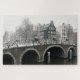 Foto de serra quebra-cabeça com canal com ponte, casas tradicionais e bicicletas sob alguma neve no inverno na capital holandesa, Amsterdã, na Holanda.