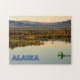 Sozinho na natureza. Uma canoa joga água espelhada do lago no interior do Alasca. Na distância típica de taiga e montanhas. A leitura de texto "Alaska" também é exibida. Esta imagem é derivada de uma fotografia do Serviço de Pesca e Vida Selvagem dos Estados Unidos.
