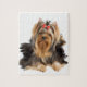 Yorkshire terrier da classe da mostra com arco vermelho no fundo branco