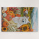 Celebre a beleza do outono com esta pintura vibrante de um cão sentado ao lado de uma bela colheita de Ação de Graças. As ricas cores do outono de abóboras, girassóis e paisagem rural rústica criam uma atmosfera quente e convidativa, perfeita para a decoração sazonal de qualquer amante de cachorro.