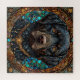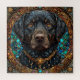 Retrato bem detalhado e estilizado de um cão labrador negro. A expressão do cão é impressionante, com olhos profundos e cheios de alma que transmitem inteligência e calor. Ao redor do cão está uma intrincada e decorativa borda que combina elementos como pedras magnéticas e padrões ornamentados, criando uma atmosfera mística e regal. O uso de cores ricas, particularmente azuis e dourados, melhora o talento artístico, dando a toda a imagem uma qualidade fantástica. A coleira do cão parece embelezada, aumentando a elegância geral da peça.