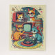 Quebra-cabeça em uma ilustração química com quatro gatos brincalhões desfrutando de dispositivos retrormédia. Um gato senta-se ao lado de uma TV antiga, enquanto outro, vestindo óculos vermelhos, está empoleirado em pilhas de livros e discos. Um tocador de cassetes e giros evoca uma estética do século médio.